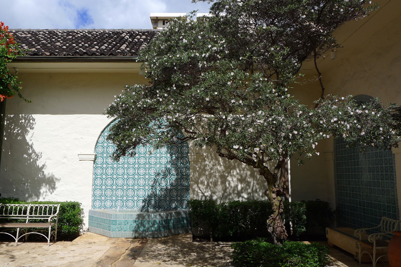 個人のコレクションからスタートしたというホノルル美術館の収蔵作品は、今ではアメリカ、アジア、中近東、ヨーロッパ、アフリカなど世界各国に渡っているそうだ。中央の広い中庭の西にあるチャイニーズコートヤードに面して、中国、韓国、日本、アジア圏の仏教美術の展示室が並んでいる。その北側のパームコートヤードにはインドやイスラムの美術品。中央東の地中海コートヤードには印象派などヨーロッパの作品。カフェ前のテラスを含め、大小あわせて6個の中庭が並んでいることになる。それぞれの中庭に面した展示室はみんな明るく気持よく、展示作品は数こそ少ないがセレクトされた趣味の良さが感じられる。エスニックな作品群もさることながら、それぞれ趣の違う中庭の設計に私はいたく魅了された。一番のお気に入りは、噴水がある地中海風の中庭。紅い花の下の白いベンチに誘われるように腰を下ろした。中世の教会のような回廊を歩き、迷路のような中庭を巡って展示作品を見ていると、いろんな国の文化が混ざり合ったハワイ独特の多文化構造の一端に少しだけ触れたような気がした。