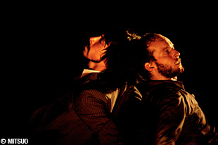 | 異なる文化背景をもつシェルカウイ(右)と首藤が、階段を設えた舞台でドラマティックに交流。Photo / MITSUO |