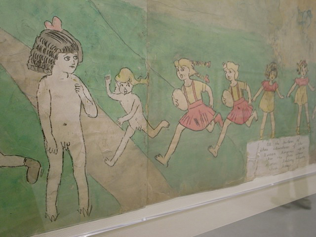 予備知識なしで入ったのだが、館内にはアール・ブリュット(アウトサイダー・アート)のコレクションもあり、予期せずヘンリー・ダーガーの少女たちの絵に出くわして、こんなところで会うなんてと驚いた。アール・ブリュットの一連の作品からは、人間の心の深みに直結するようなむき出しの感情がストレートに伝わって、他人の日記を盗み読みするような、ある種の後ろめたさや危うさをいつも感じてしまう。広く静かな薄暗い館内、一人っきりでダーガーの絵を見ているのは、ちょっと危ない体験かもと気にしながら、つい見入ってしまう。