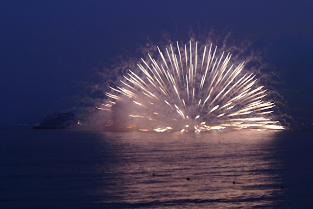鎌倉(由比ケ浜と材木座海岸)の花火大会は7月25日、今年は水曜の晩だった。休日には開催しないという決まりでもあるのか、これまで見物する機会がなかったが、今年からは曜日に関係なく楽しめる身分となった。その前の6月2日、隣りの逗子海岸で例年より早い時期に開催された花火大会も見に行ったのだが、当日はあいにく風が弱く、フィナーレの10分で5,000発の超目玉特大花火もほぼ煙の中。まあ音だけは豪勢だったが不満が残った。そこで起死回生、一発逆転、期待を込めて夕方から見物に出かけた。由比ケ浜は混んでそうだったので、手前の材木座で見ることにする。打ち上げ間際でも浜には空席スペースがまだ残っている。私は写真を撮りやすいように、船具置き場がある堤防の上に席を取った。天候は晴れ、時折風も吹く絶好のコンディション。しかし7月末の午後7時はまだ夕焼けの残照が残り、完全に暮れきらない黄昏時での花火となったが、これがなかなか風情があった。由比ケ浜沖合の台船から打ち上げる花火と、船を動かしながら海に投げ込む水中花火は海面に反射して美しい。1時間で2,500発という玉数は、隅田川の20,000発に比べるといかにも寂しいが、花火の楽しみは玉数に比例しないことがよくわかる。砂浜からでも間近に見えるのだが、遮る物の無い海と空の無限大の空間では花火も小さく感じてしまう。周りに高い山がないせいか、音も遠くに感じた。鎌倉という場所柄もあってか、遠い夏の花火の記憶と現在進行中の花火がダブルイメージとなり、そのタイムラグを懐かしく楽しんだ。葉山の後、江ノ島の花火大会(8月21日)の頃には夏もそろそろ終わる段取りなのだが、今年のこのクソ暑さ、まだなかなかフィナーレを迎える気配がない。