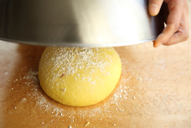 6. ④の表面がつるつるになってきたら、一つに丸め綴じ目を下にして上に打ち粉を振るい②で使用したボールをかぶせて30分おく。