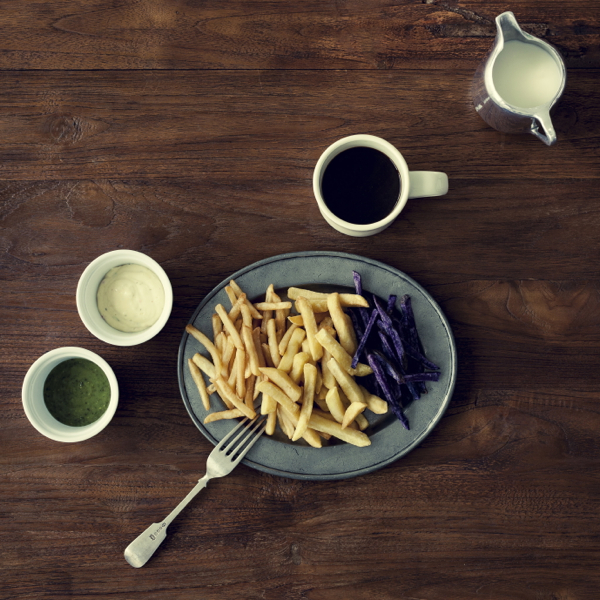A:全てのディップは、あくまでもフレンチフライに合うというテーマをもとに味付けています。ですので、通常のマヨネーズの味を想像してい召し上がるとびっくりされるかもしれませんね。フライされたじゃが芋には、ちょっと酸味が強い方がお芋の甘みが引き立つと思い今の味に決まりました。