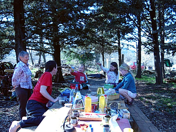 | ドイツから奥様Ute(ウットゥ)のご両親が遊びに来た日、お庭でのひと時。左からおばあさん、アクセル、Camille(カミーユ)、Matilda(マチルダ)、サシャ。 |