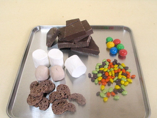 奥から板チョコレート、白いマシュマロとチョコ練りマシュマロ、しみチョコチップ、マーブルチョコ2種類。