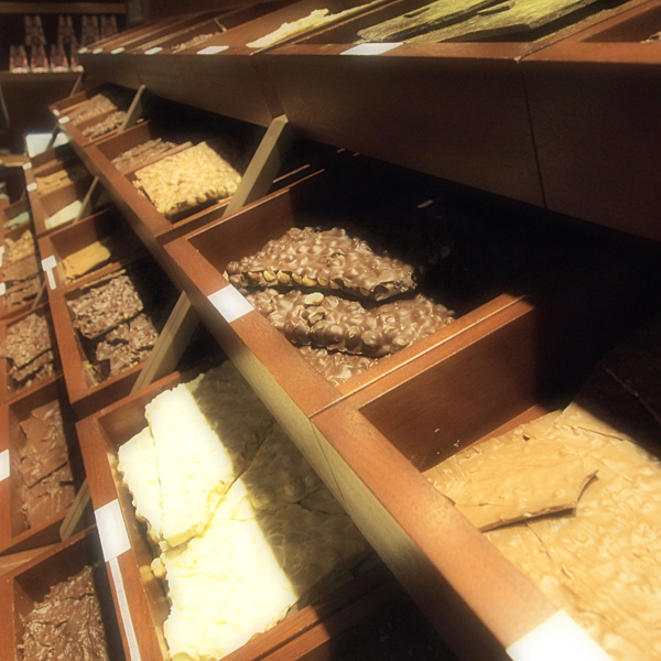『Blondel』の代表作は”marteau” マルトーという大きな板状のチョコレート。ショコラ・マティエールにひとつひとつ味わい、舌触りの際立った素材を練り込んだフレーバーが32種類あります。これらをハンマーで割っての計り売りです。ヘーゼルナッツをローストして風味を封じ込めた「ノアゼット ノアール」、80%のブラックチョコレートをココアパウダーで包んだ「ノアール80%」、繊維質の刻み生姜入「ジャンジャンブル」、カマルグの塩とブラックチョコレート「フルール ド セル」などなど。100g=2,800円(税込)。
