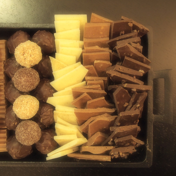 左・『ブロンデル』の代表作の板状チョコ、「マルトー(marterau)」は金槌を意味するフランス語ハンマーで割って量り売り。/右・左からプラリネ、トリュフ、マルトー。サーブする什器もしっかりしたこだわり、ぬくもりが。プラリネ、トリュフは1粒380円。