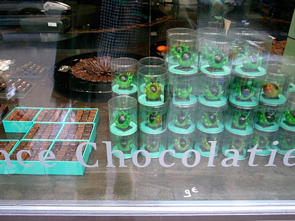 | 10月初旬のウィンドウ。秋の新作は1個9ユーロらしい。そろそろマロニエの実が大きくなる季節だし、センスのいい遊び心が感じられる。鮮やかな緑と黒褐色の丸い実の配色、大胆だ。彫刻家もびっくりしそうな造形といい、食べるのはもったいない、オブジェとして飾りたい気分。でもチョコは生ものだから早く食べないと。 |