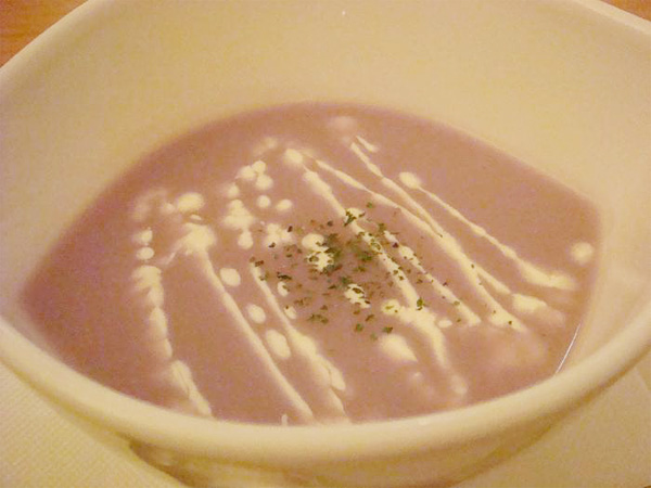 | 富良野紫いもの温スープ。地元の食材を上手に利用していて、とても美味しいスープに仕上がっていました。 |
