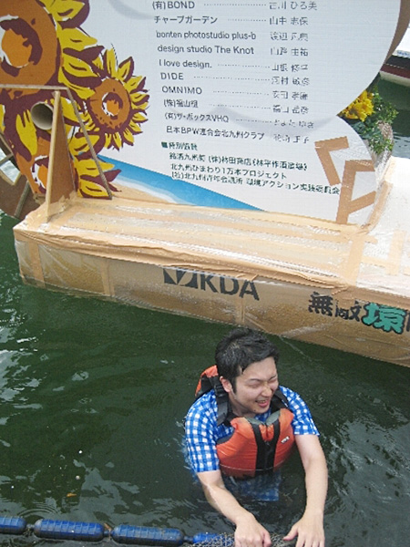 さて、わがチーム「無敵艦隊ひまわり号」は、さすが北九州デザイナーズ協会チームとあってすばらしい作品です。船体後方の水車が回ると上についているひまわりが回るというもの。ダンボールで作ったとは思えない出来栄えです。ほかのチームも負けてはいません、ダンボールに人形がついていたり、スターフライヤーチームは、飛行機をイメージした黒の船体であったり、くじらの形や、車の形をした船も御見受けしました。