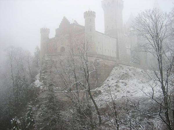 翌朝ホテルで朝食を取っていると、外は雪。上等じゃないか、ヒートテックにダウンジャケットで装備して来たし、雪のノイシュヴァンシュタインなんて最高。この日はまず、ルートヴィヒ2世が幼少期を過ごしたというホーエンシュヴァンガウ城へ向かう。この城も岩山の上に建ち、ゴシック風の十分に奇怪な建物でなかなか興味深かったが、ノイシュヴァンのあまりにも現実離れした城がすぐ近くにあるものだから、ずいぶん割を食ってる感がする。ホーエン城から眺める雪に霞むノイシュヴァンは、そのままドイツロマン主義の絵のようで、荒涼とした中に鬼気迫るものがあった。