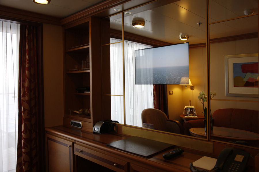 『シルバー・スピリット』の部屋の広さは約35平米。ほとんどの部屋がベランダつき。全室が大理石でバスタブとセパレートシャワーブースつき。ソファもあって部屋での食事もゆったり。リビングスペースとベッドの間にカーテンがあるのも、同室者に気を使わなくて済む憎い心配り。