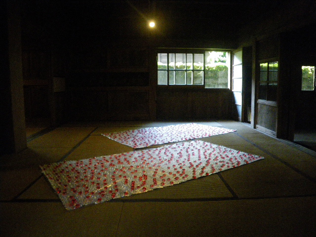 その中には、大島のシンボル、ヤブ椿からイメージしたという作品と出会いました。小学校内廊下に白いロープと椿の葉。島に滞在期間中毎日、葉を摘んで仕上げていくインスタレーション。50年も使われていない旅館、甚之丸邸。薄暗い日本家屋の広間の畳の上に赤い椿の花がちりばめられた作品。日本ライフル射撃協会の名誉会長 菊池氏の日本家屋の庭のインスタレーション。坂牛幹雄さんの椿の木の彫刻。いずれの椿の作品も、葉、花、幹と3つの部分をそれぞれに表現した島へのオマージュです。