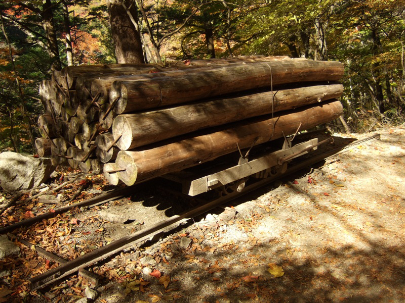 木材搬出の行程は、伐採を専門とするものと、積子(つみこ)といって丸太をトロッコに積む者、及び、運材夫といって中土場まで運び、これを塩山駅まで運ぶ業務をそれぞれ分業で行っていました。県有林からの木材搬出の合間に、民間の者も炭・薪・繭(まゆ)等の搬出、米を始め、あらゆる生活物資の搬入に、このトロッコを利用していました。
