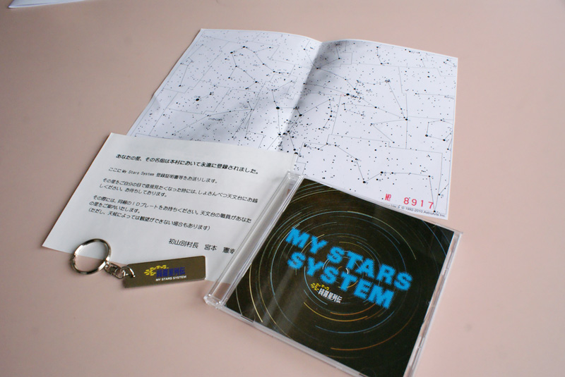 後日、星にまつわる音楽CDと刻印されたIDプレートつきキーホルダー、星図が届いた。星の名前はおうし座の中の「MOERU769」。秋には、しょさんべつ天文台に星を確かめに行こう。まわりに何もない贅沢な空間、所作案別村は星がきれいだ。