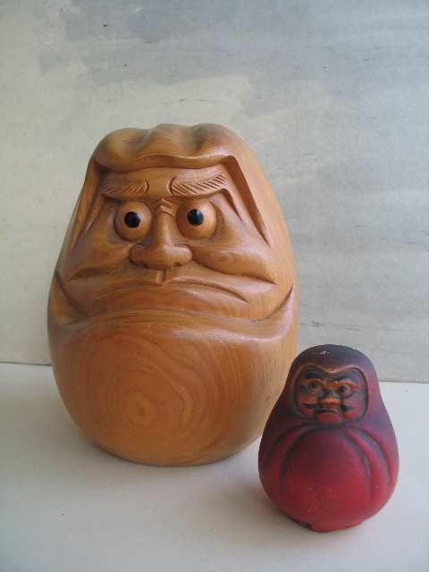我が家にはやたらある達磨群の一部。中には父の手作り達磨がある。しかしこれはあまりに顔が恐くて家族の嫌われ者に。思わず撮影からはずした。にもかかわらずそれが普通の日常にある事がおそろしい。嗚呼。大きい達磨は木彫り。ちいさい達磨さんは焼き物の貯金箱。婆様ご使用のもの。五銭、十銭と貯金していたらしい。達磨さんの愛嬌のある顔が可愛いらしい。