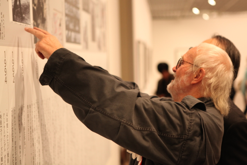 写真展開催に先立ちジョセフ・クーデルカさんの来日記者会見が東京国立近代美術館にて行われました。会場にニコニコしながら登場、設置されている自身の来歴年表パネルの写真を指さしながら説明するなど、実にラフで陽気。
