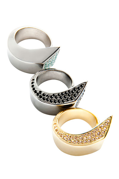 | Nicholas Kirkwood ニコラス・カークウッドのリング。英国の若手靴デザイナーが初挑戦するジュエリーは、シャープなカットラインながらもフェミニンな仕上がりに。各26,355円 |