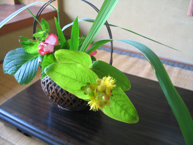 花材 カヤ、アヤメ、アジサイ、サツキ、オトギリソウ。
