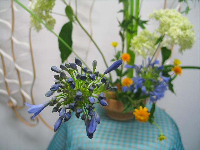 写真は正木さんの作品です。写真を撮った後、少しお直ししましたが珍しく華奢な作りのアガパンサスを主役に仕立て涼しげに活けてくれたのでアップしました。