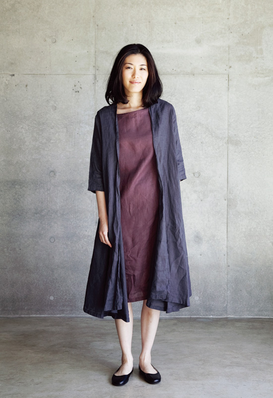 じつは「FLW」の服を重ねてきるときに、どの色、どのアイテムを組み合わせてもうまくコーディネートできるように考えてつくられています。例えば、シンプルなノースリーブのドレスは、ラップコートに合わせるために作ったのだそうです。1枚で着てもキレイですが、コートと合わせるととてもしっくりときます。こういうところにスタイリストさんならではのコーディネートの発想が生かされているのでしょうか。