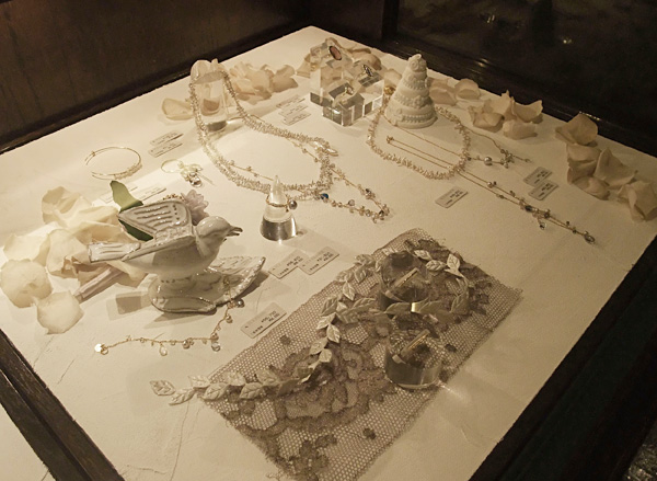 | 手前が、『ソニア・ボヤジャン』のブライダルジュエリー。高価なメタルワイヤーに、大ぶりのクリスタル。リボンの結び方次第で表情が変わります。129,150円 |