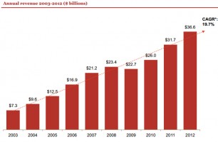The Interactive Advertising Bureau (IAB) と米 PwCがまとめた「the IAB Internet Advertising Revenue Report(2012年通期)」によると、2012年の米国のインターネット広告売上げは366億ドルと、前年比で15%増となった。2003年以降の 年間インターネット広告売上をプロットしたのが次のグラフである。