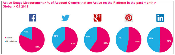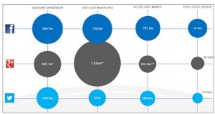 エンゲージメントの比較は次の通り。先月のアクティブユーザー数では、Facebookが7億100万人、Google+ が3億5900万人、Twitterが2億9600万人となっている。Google+ の先月の訪問者数が驚くほど高いのは、Google+ プラットフォームの利用ではなくて、G+レイヤー(eg Gmail etc)の利用も計数しているため。わたしもどこかのボタンを押してしまって、知らないうちに登録されていたので、Gmailを使うたびにアクティブユーザーと見られていたようだ。