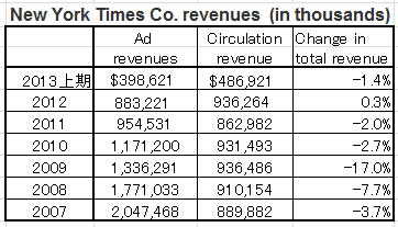 2013年第2四半期(2013年6月)のデジタル購読者数は69万9000人で、ボストン・グローブを含むと73万8000人となる。前年同期に比べて40%も購読者数を増やしている。確かに、NYタイムズの電子版の有料サービスは順調に滑り出していることは間違いない。でも不安は残る。デジタル購読収入がNYタイムズを支える大きな成長エンジンになりうるかとなると、まだまだ不透明である。