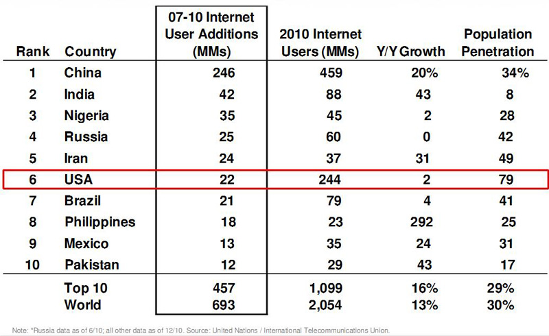 次は、過去3年間でインターネットユーザーの純増数の多かった国のランキングである。トップ10には、米国以外は新興国が占めている。中国は別格として、 ナイジェリア、イラン、フィリピン、パキスタンと意外な国が入っている。グローバル展開するインターネット企業にとって、こうした急成長する新興国市場に も力を注ぐことになる。