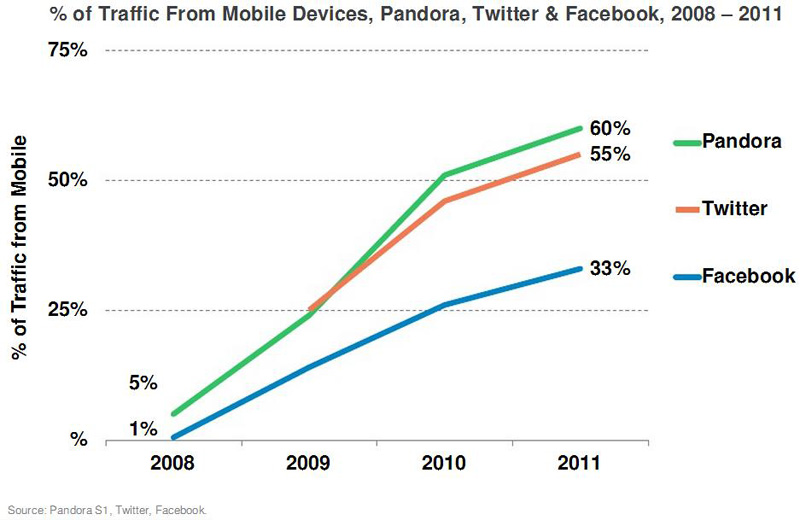 モバイルについては、日韓に比べ後進国であった米国も、ここにきて急速にモバイルインターネットが浸透してきた。Pandora、Twitter、 Facebookの各サイトへのトラフィックのうち、モバイル端末からのトラフィックの割合が、以下のように急増してきた。