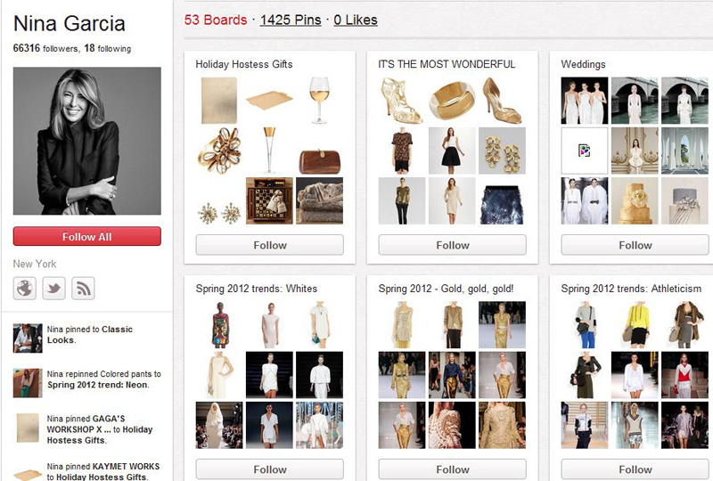 この例から分かるように、個人ブランドを高める格好の場としても 興味深い。カリスマのファッションジャーナリスト・評論家として有名なNina Garcia氏も、Pinterestを新たな活躍の場として利用し始めている。Wikipediaによると、彼女は女性誌「Elle」や「Marie claire」のファッションディレクターも務めている。すでにツイッター@ninagarcia http://www.ninagarcia.com/)では31万8477人のフォロワーを抱えているが、新たに始めるPinterestではファッション分野だけにより大きな効果を発揮しそう。