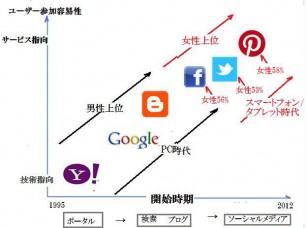 少し前まで、ネットの世界は男性が支配していたはずなのに。ネットサービスをより十分に享受するには、PC(ハード)やOSの技術を知っているかどうかに かかっている傾向があったからだ。男性がまだ威張れる時代であった。だが、一般ユーザーにとってハードやOSがブラックボックス化していき、誰もがサービ スを楽しめるようになってきた。さらに、ソーシャルメディアのサービスでは、コンテンツ作成の敷居がドンドン低くなってきた。誰もが気楽に参加できるコミュニティが次々と生まれてきている。こうなると、井戸端コミュニティを得意とする女性が目立つようになるのも当然か。
