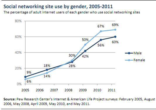 米国のSNS利用調査でも、このトレンドを浮き彫りにしている。米成人のインターネットユーザーのうち、男女別にSNS利用率の推移をプロットしたのが次 のグラフである。女性の利用率が高まっている。2011年では、女性のネットユーザーの69%がSNSを利用しているのに対し、男性のネットユーザーでは 60%に留まっている。また毎日SNSにアクセスする割合も、女性が約半分の48%なのに、男性は38%である。女性のほうが熱中度が高いと言えそう。こ れは、Pew Research Centerの調査データより(2011年のデータは昨年5月調査)。