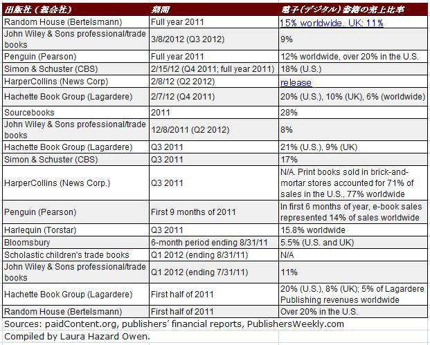 paidContentが、主要出版社の電子書籍売上比率などを一覧表でまとめていたので、その一部を以下に掲げておく(ソースの一覧表はこちらで)。
