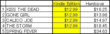 現時点でトップ5のベストセラー小説の、ハードカバー書籍と電子書籍の販売価格を以下に示しておく。5位の「Spring Fever」のキンドル版電子書籍は単体では売られていないようだ。