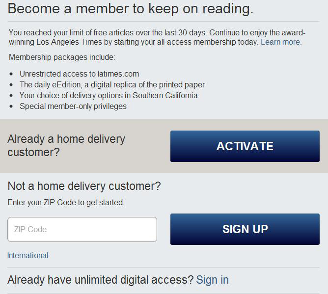 そこで今年3月からメーター制課金を開始したLAタイムズのサイトで試してみた。月間15本の記事までを無料閲覧できるメーター制を採用していた。そこで、15本の記事 ページを次々と開いてみた。そして16本目の記事見出しをクリックすると、次のようなメッセージのpaywallが現れて、これ以上は有料であることが告 げられた。でも、16本目の記事見出しを検索キーとして、グーグル検索エンジン経由でアクセスすると、以下のpaywallが現れずに無料で閲覧できた。