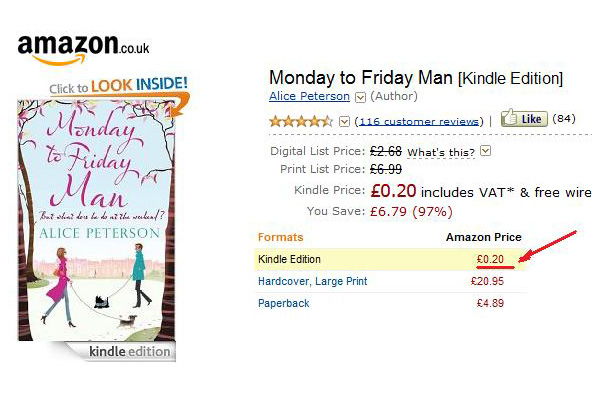 英アマゾンで電子本が勢いよく売れているのには、印刷本に比べ販売価格が安いことと、割引を絶えず実施していることも見逃せない。例えば毎日11:59 pmには、Kindle Daily Dealで新刊本の割引を発表する。