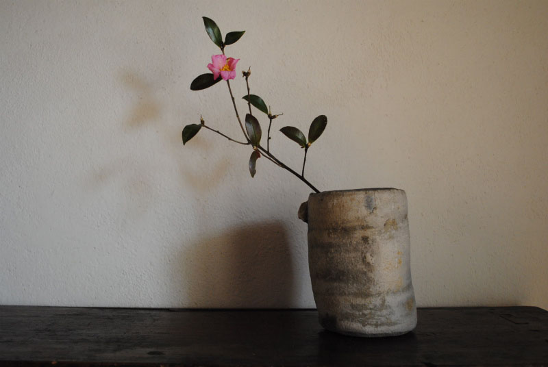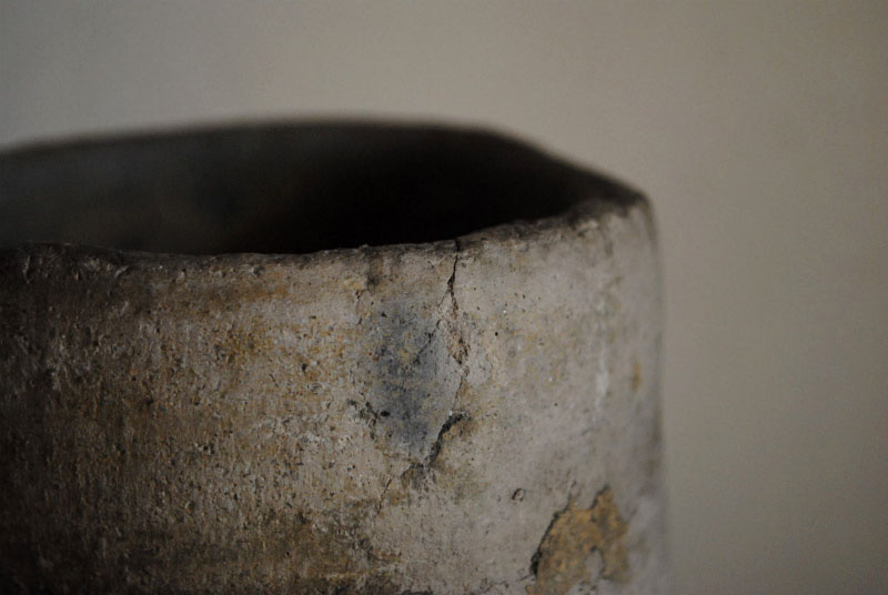 写真の経筒は陶製のものである。しかし一般的なものよりもかなり小さい。作家の白洲正子氏が持っていた坂東三津五郎旧蔵の経筒と比較すれば、10cm程度も差がある。この経筒の一番の魅力は、くねった体つきと強い轆轤目になると思うが、1つだけ残った耳(元は3つ)が大変良いバランスで存在しているところも見逃せない。こんなに小さい経筒では当然中身の写経も幅が狭くなるのだが、紙が大変な貴重品である事を鑑みると、都から随分と離れた貧しい田舎の地で作られたのかも知れない。