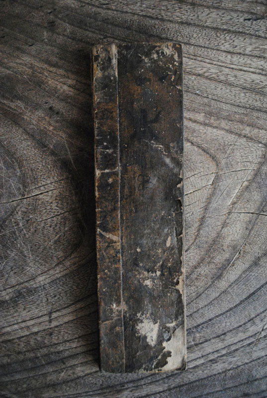 写真の水滴と粉板は朝鮮王朝時代後期に作られたものです。粉板とは習字の練習板のことで、本来は板書をするため800mm程度の木の板であることが多いのですが、これは紙で作られた携帯用です。朝鮮王朝時代は儒教が流布していて勉学に励むことで徳を積めると考えられていましたので、外でも字の練習に励んでいたのでしょうか。紙とはいっても手紙などの反古を使用して厚みを作り、表面には字が書きやすいように白漆を塗布してあります。これは黒漆では字の判別がしにくく、朱漆は高価であった所以かも知れません。手摺れで角が丸くなり、紙の表面はテカテカになっています。この粉板は「ありふれた風貌の、唯一無二の個性」という朝鮮の工芸の特質をよく現しているのではないでしょうか。